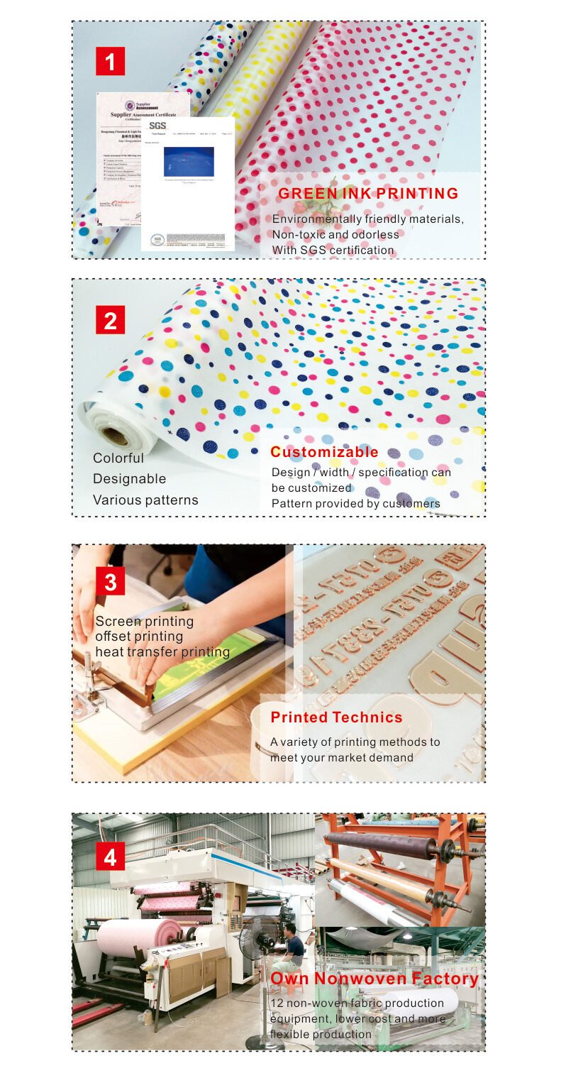 We believe in enabling you to express your unique style. Our printed non woven fabric offers customization options, allowing you to create personalized designs that reflect your vision. Whether you have a specific pattern, artwork, or logo in mind, our fabric can be customized to meet your requirements, making it perfect for branding, special events, and promotional purposes.